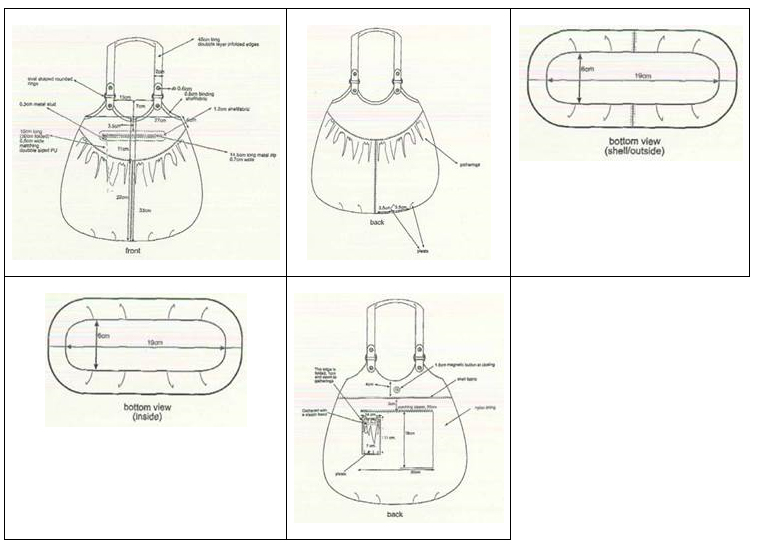 - i due design avevano caratteristiche in comune quali il contorno superiore e la presenza di un manico a forma di cinghia(e) attaccata(e) al corpo tramite un sistema di anelli rinforzato da rivetti, ma anche differenze differenze significative di forma, struttura e finitura superficiale che assumevano un ruolo decisivo nell’impressione complessiva prodotta dalle due borse;